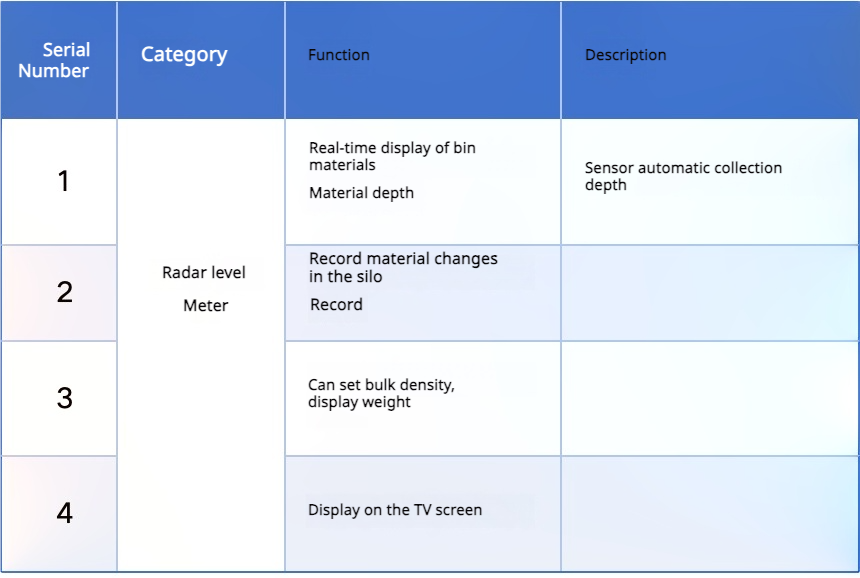 Collection of material depth in silos, raw material bulk bins, finished product bulk bins, batching bins, crushing bins, and finished product bins.